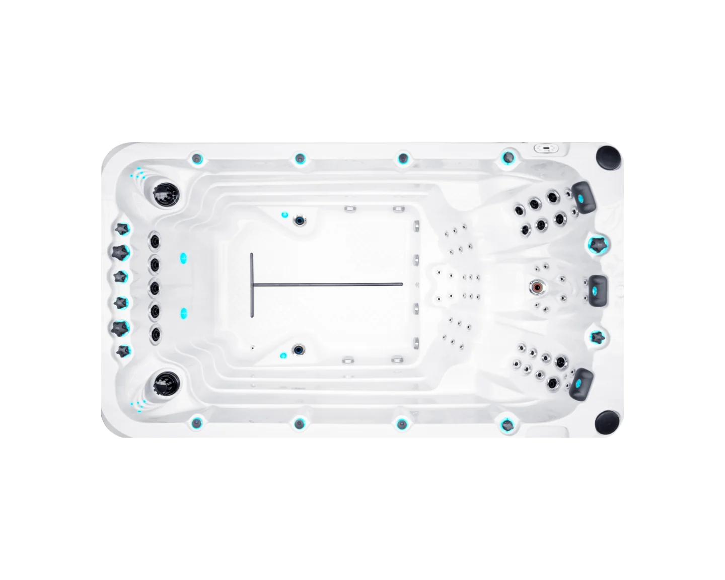 River Swim System se sastoji od 5 velikih mlaznica raspoređenih linearno, koje stvaraju konstantan tok vode preko cele širine swim spa kade. Intenzitet vodenog toka se može podešavati, a pritom se protok ravnomerno raspoređuje preko cele širine. Zahvaljujući ovoj jedinstvenoj tehnologiji, vodeni tok pokriva široko područje i pozicioniran je ispod površine vode, omogućavajući plivaču da glavu drži udobno iznad vode. Kada se smanji intenzitet sistema, automatski se aktivira Current-Lift Technology, omogućavajući plivaču da ostane u položaju za plivanje.